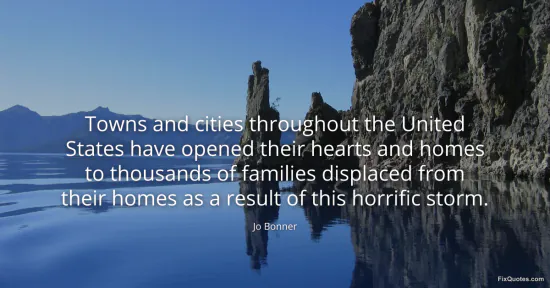 Bonner, Jo. "Towns and cities throughout the United States have opened their hearts and homes to thousands of families displaced from their homes as a result of this horrific storm." FixQuotes. January 17, 2026. https://fixquotes.com/quotes/towns-and-cities-throughout-the-united-states-58735/.