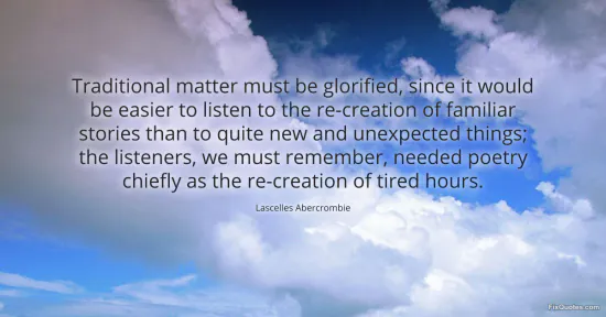 Abercrombie, Lascelles. "Traditional matter must be glorified, since it would be easier to listen to the re-creation of familiar stories than to quite new and unexpected things; the listeners, we must remember, needed poetry chiefly as the re-creation of tired hours." FixQuotes. January 18, 2026. https://fixquotes.com/quotes/traditional-matter-must-be-glorified-since-it-18189/.