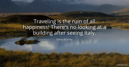 Burney, Fanny. "Traveling is the ruin of all happiness! There's no looking at a building after seeing Italy." FixQuotes. January 17, 2026. https://fixquotes.com/quotes/traveling-is-the-ruin-of-all-happiness-theres-no-54166/.