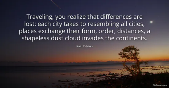 "Traveling, you realize that differences are lost: each city takes to resembling all cities, places exchange their form, order, distances, a shapeless dust cloud invades the continents." FixQuotes, 16 Jan. 2026, https://fixquotes.com/quotes/traveling-you-realize-that-differences-are-lost-112001/. Accessed 12 Feb. 2026.