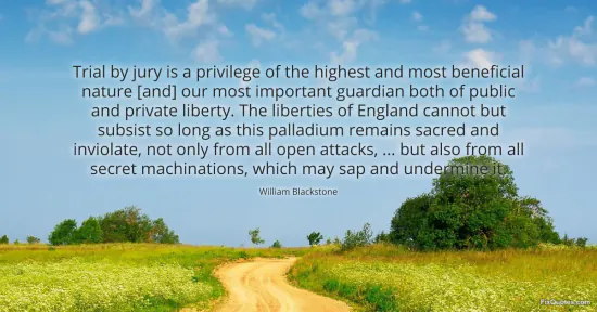 Blackstone, William. "Trial by jury is a privilege of the highest and most beneficial nature [and] our most important guardian both of public and private liberty. The liberties of England cannot but subsist so long as this palladium remains sacred and inviolate, not only from all open attacks, ... but also from all secret machinations, which may sap and undermine it." FixQuotes. January 11, 2026. https://fixquotes.com/quotes/trial-by-jury-is-a-privilege-of-the-highest-and-173724/.