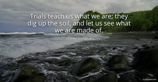 Spurgeon, Charles. (n.d.). Trials teach us what we are; they dig up the soil, and let us see what we are made of. FixQuotes. https://fixquotes.com/quotes/trials-teach-us-what-we-are-they-dig-up-the-soil-35160/