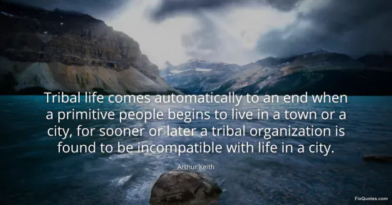 Keith, Arthur. "Tribal life comes automatically to an end when a primitive people begins to live in a town or a city, for sooner or later a tribal organization is found to be incompatible with life in a city." FixQuotes. January 17, 2026. https://fixquotes.com/quotes/tribal-life-comes-automatically-to-an-end-when-a-36958/.