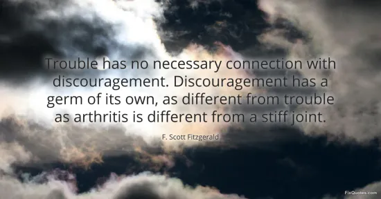 Fitzgerald draws a scalpel line between what happens to you and what you let it become. Trouble, in his framing, is an external weather system: it can soak you, freeze you, knock the roof off. Discouragement is internal pathology, a self-propagating condition with its own “germ,” its own logic, its own appetite. The move is classic Fitzgerald: elegant metaphor doing brutal psychological work. He refuses the comforting myth that despair is a noble, inevitable response to hardship. Instead, he treats it as something closer to infection - catchable, cultivable, preventable, and, once rooted, capable of spreading beyond the original wound.