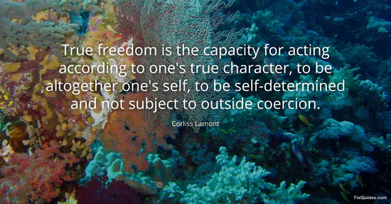 Lamont, Corliss. (2026, January 16). True freedom is the capacity for acting according to one's true character, to be altogether one's self, to be self-determined and not subject to outside coercion. FixQuotes. https://fixquotes.com/quotes/true-freedom-is-the-capacity-for-acting-according-124273/