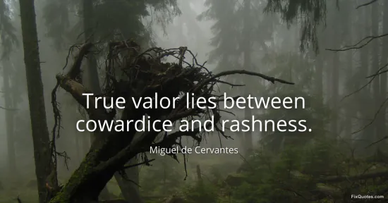 Cervantes nails valor to a narrow ridge line: not the swaggering leap of the fool, not the retreat of the self-protective, but the disciplined choice to stand where fear and impulse both tug. The sentence works because it refuses the romantic version of courage. It treats bravery less like a personality trait and more like a calibration problem: how to act under pressure without letting panic or ego seize the steering wheel.