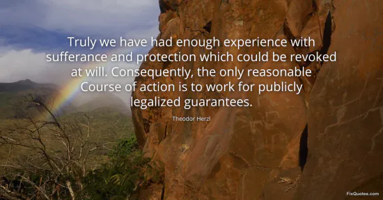 Herzl, Theodor. "Truly we have had enough experience with sufferance and protection which could be revoked at will. Consequently, the only reasonable Course of action is to work for publicly legalized guarantees." FixQuotes. January 15, 2026. https://fixquotes.com/quotes/truly-we-have-had-enough-experience-with-165083/.