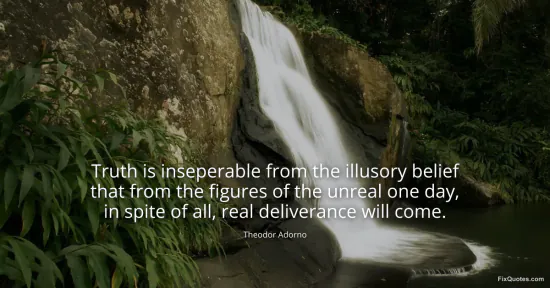 Adorno, Theodor. "Truth is inseperable from the illusory belief that from the figures of the unreal one day, in spite of all, real deliverance will come." FixQuotes. January 17, 2026. https://fixquotes.com/quotes/truth-is-inseperable-from-the-illusory-belief-36087/.