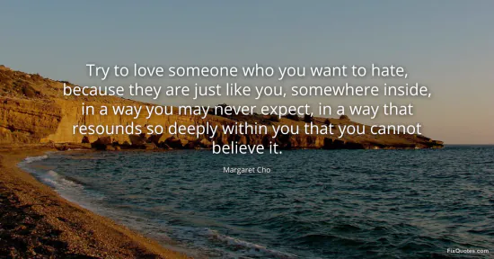 Cho, Margaret. (2026, January 16). Try to love someone who you want to hate, because they are just like you, somewhere inside, in a way you may never expect, in a way that resounds so deeply within you that you cannot believe it. FixQuotes. https://fixquotes.com/quotes/try-to-love-someone-who-you-want-to-hate-because-107932/