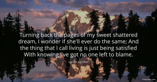 Lightfoot, Gordon. "Turning back the pages of my sweet shattered dream, I wonder if she'll ever do the same; And the thing that I call living is just being satisfied With knowing I've got no one left to blame." FixQuotes. January 15, 2026. https://fixquotes.com/quotes/turning-back-the-pages-of-my-sweet-shattered-167525/.