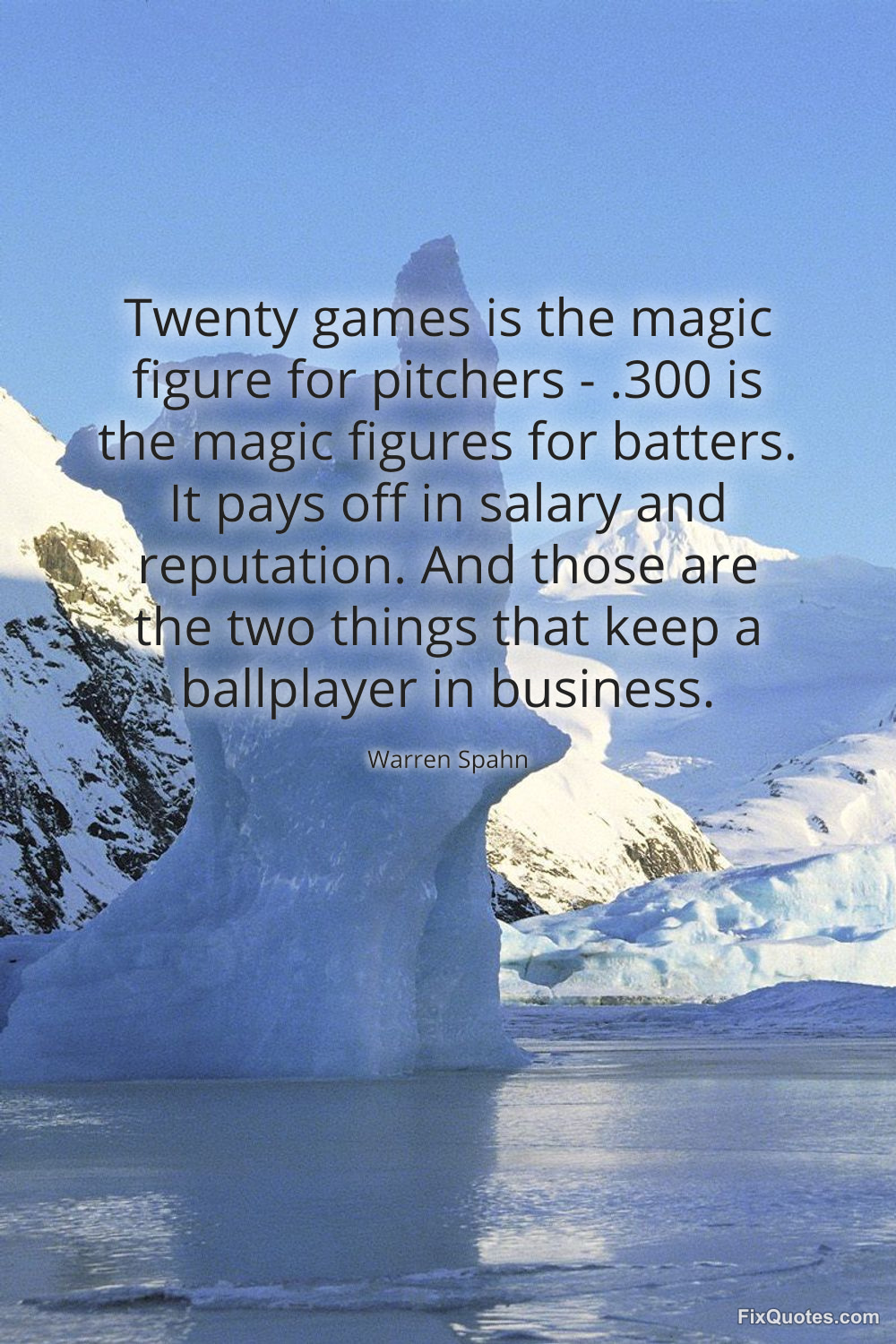 Spahn, Warren. "Twenty games is the magic figure for pitchers - .300 is the magic figures for batters. It pays off in salary and reputation. And those are the two things that keep a ballplayer in business." FixQuotes. January 16, 2026. https://fixquotes.com/quotes/twenty-games-is-the-magic-figure-for-pitchers-131207/.