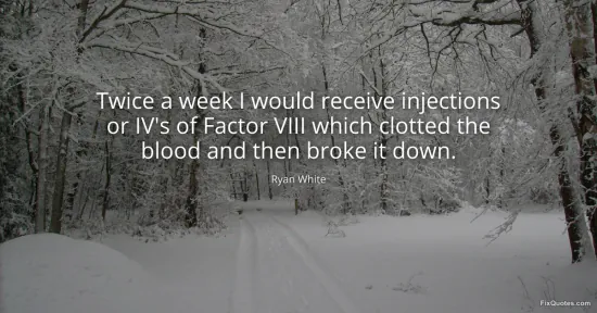 White, Ryan. (2026, January 16). Twice a week I would receive injections or IV's of Factor VIII which clotted the blood and then broke it down. FixQuotes. https://fixquotes.com/quotes/twice-a-week-i-would-receive-injections-or-ivs-of-123024/