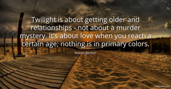 Benton, Robert. (2026, January 15). Twilight is about getting older and relationships - not about a murder mystery. It's about love when you reach a certain age; nothing is in primary colors. FixQuotes. https://fixquotes.com/quotes/twilight-is-about-getting-older-and-relationships-149947/