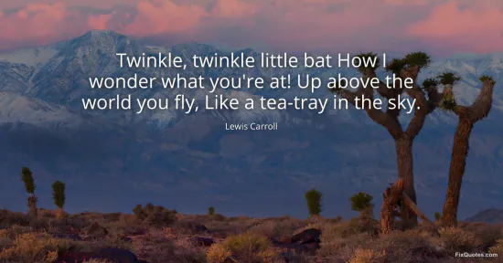 Carroll, Lewis. (2026, January 18). Twinkle, twinkle little bat How I wonder what you're at! Up above the world you fly, Like a tea-tray in the sky. FixQuotes. https://fixquotes.com/quotes/twinkle-twinkle-little-bat-how-i-wonder-what-8351/