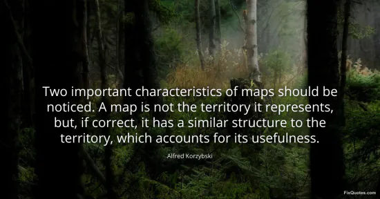 Korzybski, Alfred. "Two important characteristics of maps should be noticed. A map is not the territory it represents, but, if correct, it has a similar structure to the territory, which accounts for its usefulness." FixQuotes. January 16, 2026. https://fixquotes.com/quotes/two-important-characteristics-of-maps-should-be-122598/.