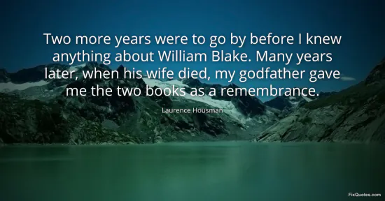 Housman, Laurence. "Two more years were to go by before I knew anything about William Blake. Many years later, when his wife died, my godfather gave me the two books as a remembrance." FixQuotes. January 17, 2026. https://fixquotes.com/quotes/two-more-years-were-to-go-by-before-i-knew-72262/.