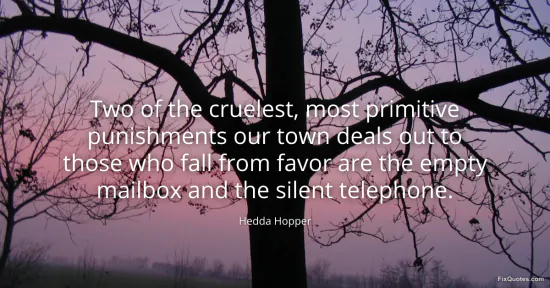 Hopper, Hedda. (2026, January 17). Two of the cruelest, most primitive punishments our town deals out to those who fall from favor are the empty mailbox and the silent telephone. FixQuotes. https://fixquotes.com/quotes/two-of-the-cruelest-most-primitive-punishments-79319/