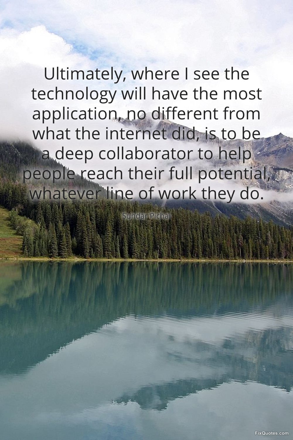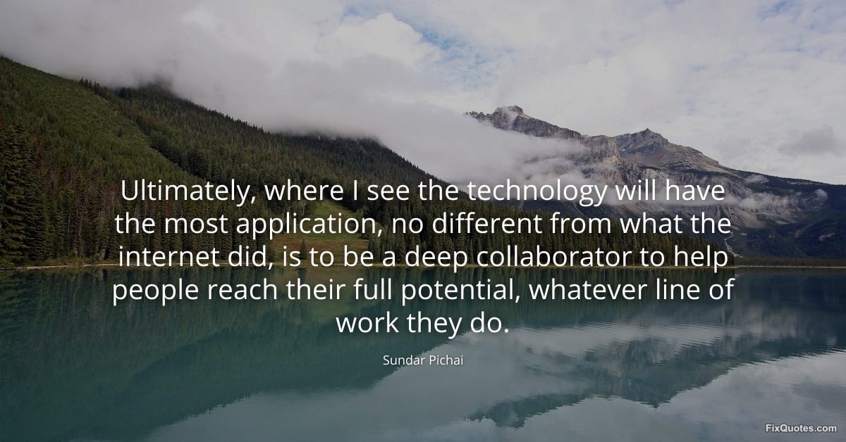 Pichai, Sundar. (2026, April 3). Ultimately, where I see the technology will have the most application, no different from what the internet did, is to be a deep collaborator to help people reach their full potential, whatever line of work they do. FixQuotes. https://fixquotes.com/quotes/ultimately-where-i-see-the-technology-will-have-186516/