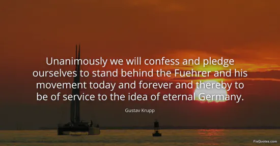 Krupp, Gustav. (2026, January 17). Unanimously we will confess and pledge ourselves to stand behind the Fuehrer and his movement today and forever and thereby to be of service to the idea of eternal Germany. FixQuotes. https://fixquotes.com/quotes/unanimously-we-will-confess-and-pledge-ourselves-60443/