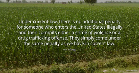 Shadegg, John. (2026, January 15). Under current law, there is no additional penalty for someone who enters the United States illegally and then commits either a crime of violence or a drug trafficking offense. They simply come under the same penalty as we have in current law. FixQuotes. https://fixquotes.com/quotes/under-current-law-there-is-no-additional-penalty-146605/