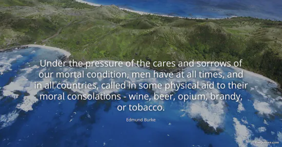 Burke, Edmund. "Under the pressure of the cares and sorrows of our mortal condition, men have at all times, and in all countries, called in some physical aid to their moral consolations - wine, beer, opium, brandy, or tobacco." FixQuotes. January 18, 2026. https://fixquotes.com/quotes/under-the-pressure-of-the-cares-and-sorrows-of-19219/.