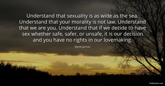 Jarman, Derek. (2026, January 16). Understand that sexuality is as wide as the sea. Understand that your morality is not law. Understand that we are you. Understand that if we decide to have sex whether safe, safer, or unsafe, it is our decision and you have no rights in our lovemaking. FixQuotes. https://fixquotes.com/quotes/understand-that-sexuality-is-as-wide-as-the-sea-111288/