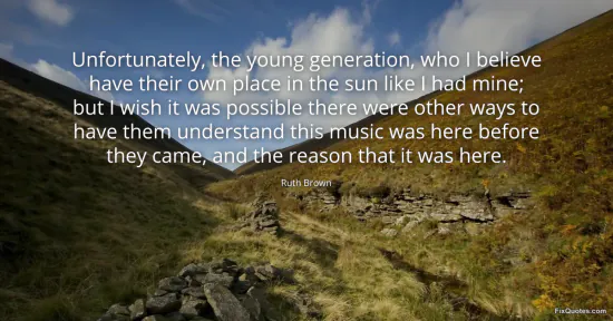 Brown, Ruth. "Unfortunately, the young generation, who I believe have their own place in the sun like I had mine; but I wish it was possible there were other ways to have them understand this music was here before they came, and the reason that it was here." FixQuotes. January 17, 2026. https://fixquotes.com/quotes/unfortunately-the-young-generation-who-i-believe-62938/.