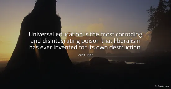 Evidence: ... of vital importance . ABRAHAM LINCOLN , PUBLIC SPEECH , 1832 Universal education is the most corroding and disintegrating poison that liberalism has ever invented for its own destruction . ADOLF HITLER , FROM HERMANN RAUSCHNING , THE VOICE ... Other candidates (1) Adolf Hitler (Adolf Hitler) compilation35.3% wormed their way into our upperclass families and the consequence has been that the ruling class has been alienated f... |