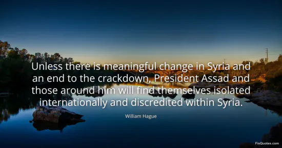 Hague, William. "Unless there is meaningful change in Syria and an end to the crackdown, President Assad and those around him will find themselves isolated internationally and discredited within Syria." FixQuotes. January 16, 2026. https://fixquotes.com/quotes/unless-there-is-meaningful-change-in-syria-and-an-90876/.