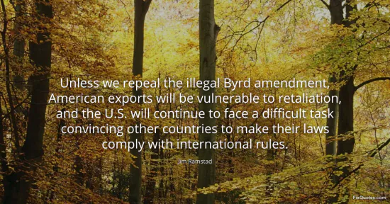 Ramstad, Jim. "Unless we repeal the illegal Byrd amendment, American exports will be vulnerable to retaliation, and the U.S. will continue to face a difficult task convincing other countries to make their laws comply with international rules." FixQuotes. January 17, 2026. https://fixquotes.com/quotes/unless-we-repeal-the-illegal-byrd-amendment-65977/.