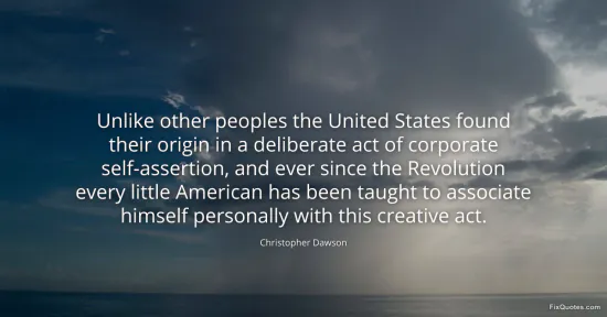 Dawson, Christopher. "Unlike other peoples the United States found their origin in a deliberate act of corporate self-assertion, and ever since the Revolution every little American has been taught to associate himself personally with this creative act." FixQuotes. January 17, 2026. https://fixquotes.com/quotes/unlike-other-peoples-the-united-states-found-41303/.