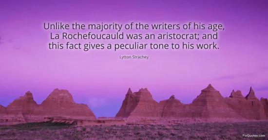 Strachey, Lytton. "Unlike the majority of the writers of his age, La Rochefoucauld was an aristocrat; and this fact gives a peculiar tone to his work." FixQuotes. January 16, 2026. https://fixquotes.com/quotes/unlike-the-majority-of-the-writers-of-his-age-la-100148/.