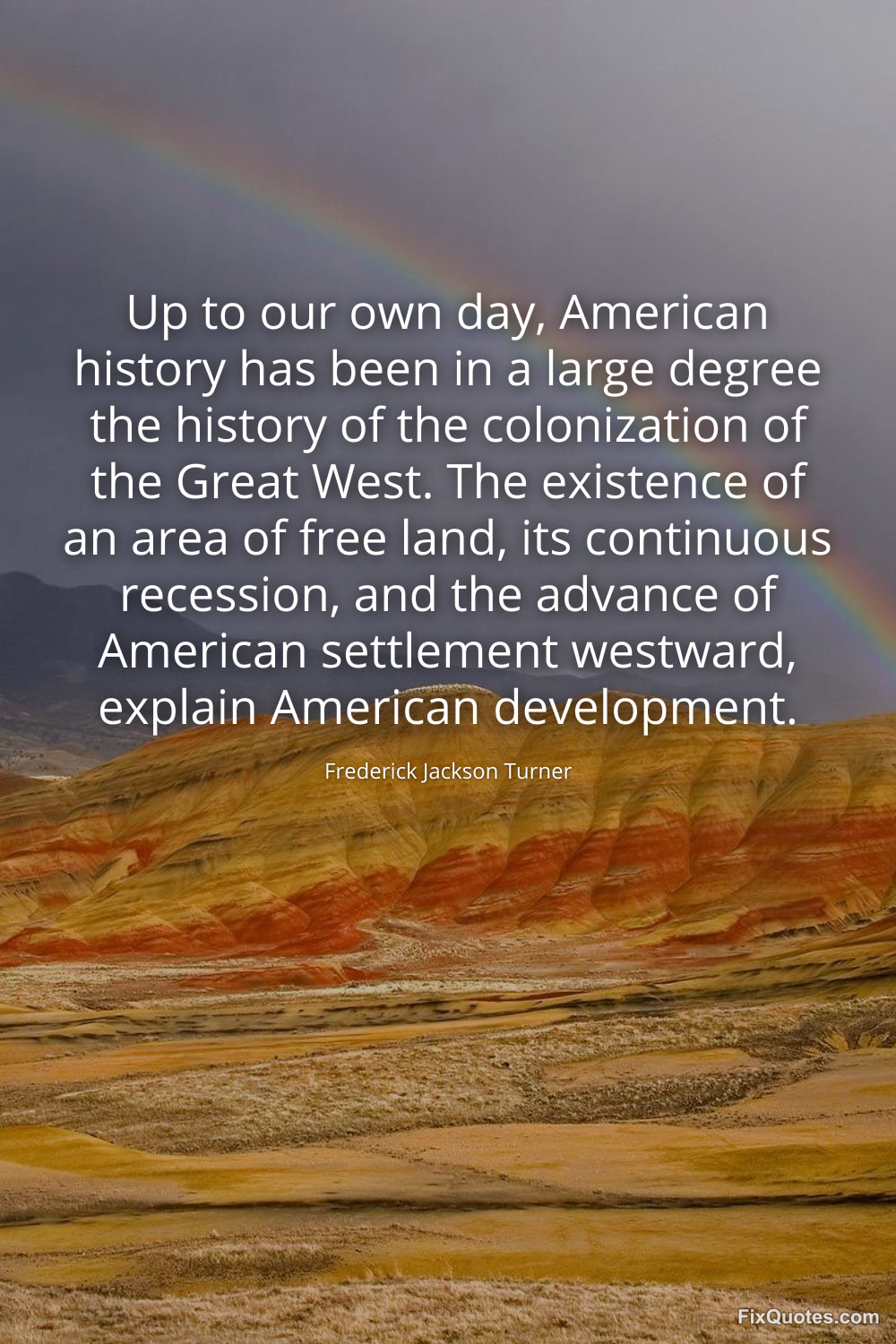 Turner, Frederick Jackson. "Up to our own day, American history has been in a large degree the history of the colonization of the Great West. The existence of an area of free land, its continuous recession, and the advance of American settlement westward, explain American development." FixQuotes. February 16, 2026. https://fixquotes.com/quotes/up-to-our-own-day-american-history-has-been-in-a-183800/.
