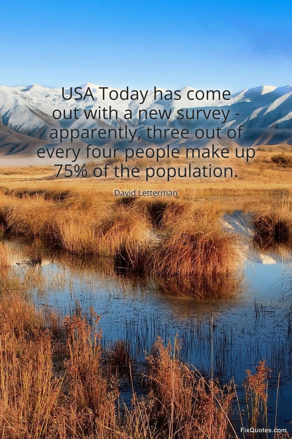 Letterman, David. (2026, January 17). USA Today has come out with a new survey - apparently, three out of every four people make up 75% of the population. FixQuotes. https://fixquotes.com/quotes/usa-today-has-come-out-with-a-new-survey-52390/