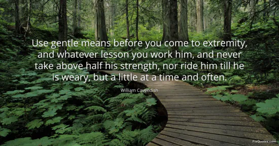 Cavendish, William. "Use gentle means before you come to extremity, and whatever lesson you work him, and never take above half his strength, nor ride him till he is weary, but a little at a time and often." FixQuotes. January 16, 2026. https://fixquotes.com/quotes/use-gentle-means-before-you-come-to-extremity-and-94118/.