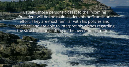 Allen, Richard V. "Usually, those persons closest to the incoming President will be the main leaders of the Transition effort. They are most familiar with his policies and practices, and are able to interpret his wishes regarding the structure and staffing of the new Administration." FixQuotes. January 16, 2026. https://fixquotes.com/quotes/usually-those-persons-closest-to-the-incoming-88182/.