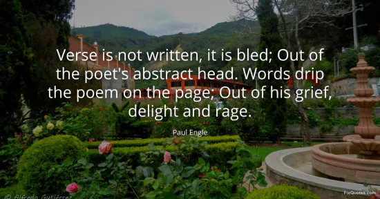 Engle, Paul. (2026, January 16). Verse is not written, it is bled; Out of the poet's abstract head. Words drip the poem on the page; Out of his grief, delight and rage. FixQuotes. https://fixquotes.com/quotes/verse-is-not-written-it-is-bled-out-of-the-poets-85366/