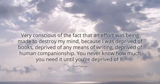Soyinka, Wole. (2026, January 16). Very conscious of the fact that an effort was being made to destroy my mind, because I was deprived of books, deprived of any means of writing, deprived of human companionship. You never know how much you need it until you're deprived of it. FixQuotes. https://fixquotes.com/quotes/very-conscious-of-the-fact-that-an-effort-was-111445/