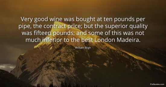 Bligh, William. "Very good wine was bought at ten pounds per pipe, the contract price; but the superior quality was fifteen pounds; and some of this was not much inferior to the best London Madeira." FixQuotes. January 16, 2026. https://fixquotes.com/quotes/very-good-wine-was-bought-at-ten-pounds-per-pipe-104675/.