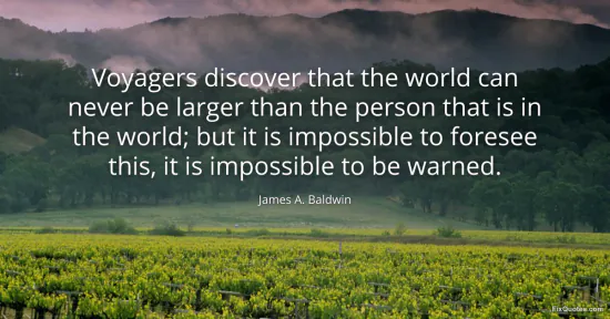 Baldwin, James A. "Voyagers discover that the world can never be larger than the person that is in the world; but it is impossible to foresee this, it is impossible to be warned." FixQuotes. January 17, 2026. https://fixquotes.com/quotes/voyagers-discover-that-the-world-can-never-be-34045/.
