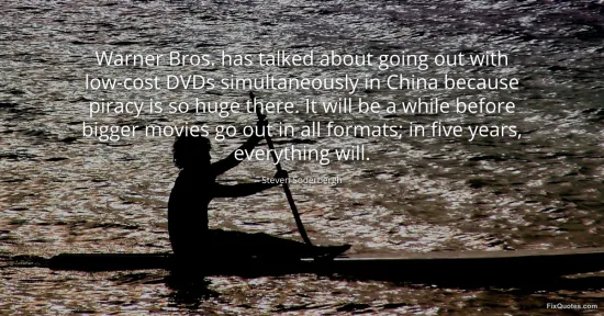 Soderbergh, Steven. (2026, January 16). Warner Bros. has talked about going out with low-cost DVDs simultaneously in China because piracy is so huge there. It will be a while before bigger movies go out in all formats; in five years, everything will. FixQuotes. https://fixquotes.com/quotes/warner-bros-has-talked-about-going-out-with-97959/
