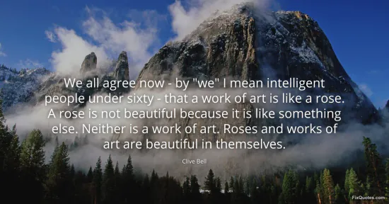 Bell, Clive. (2026, January 15). We all agree now - by "we" I mean intelligent people under sixty - that a work of art is like a rose. A rose is not beautiful because it is like something else. Neither is a work of art. Roses and works of art are beautiful in themselves. FixQuotes. https://fixquotes.com/quotes/we-all-agree-now-by-we-i-mean-intelligent-167214/