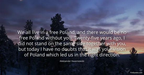 Kwasniewski, Aleksander. "We all live in a free Poland, and there would be no free Poland without you. Twenty-five years ago, I did not stand on the same side together with you, but today I have no doubts that it was your vision of Poland which led us in the right direction." FixQuotes. February 16, 2026. https://fixquotes.com/quotes/we-all-live-in-a-free-poland-and-there-would-be-130791/.