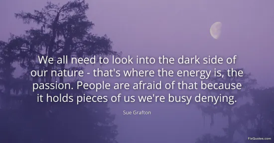 Grafton, Sue. "We all need to look into the dark side of our nature - that's where the energy is, the passion. People are afraid of that because it holds pieces of us we're busy denying." FixQuotes. January 15, 2026. https://fixquotes.com/quotes/we-all-need-to-look-into-the-dark-side-of-our-159970/.