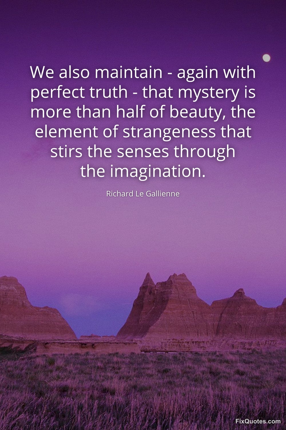Gallienne, Richard Le. (2026, January 16). We also maintain - again with perfect truth - that mystery is more than half of beauty, the element of strangeness that stirs the senses through the imagination. FixQuotes. https://fixquotes.com/quotes/we-also-maintain-again-with-perfect-truth-89880/