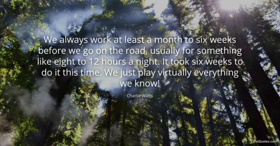 Watts, Charlie. "We always work at least a month to six weeks before we go on the road, usually for something like eight to 12 hours a night. It took six weeks to do it this time. We just play virtually everything we know!" FixQuotes. February 19, 2026. https://fixquotes.com/quotes/we-always-work-at-least-a-month-to-six-weeks-50937/.