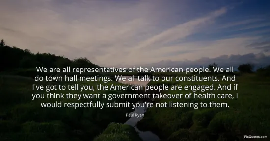 Ryan, Paul. (2026, January 16). We are all representatives of the American people. We all do town hall meetings. We all talk to our constituents. And I've got to tell you, the American people are engaged. And if you think they want a government takeover of health care, I would respectfully submit you're not listening to them. FixQuotes. https://fixquotes.com/quotes/we-are-all-representatives-of-the-american-people-84499/