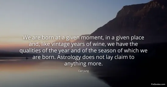 Jung, Carl. (2026, February 9). We are born at a given moment, in a given place and, like vintage years of wine, we have the qualities of the year and of the season of which we are born. Astrology does not lay claim to anything more. FixQuotes. https://fixquotes.com/quotes/we-are-born-at-a-given-moment-in-a-given-place-34671/