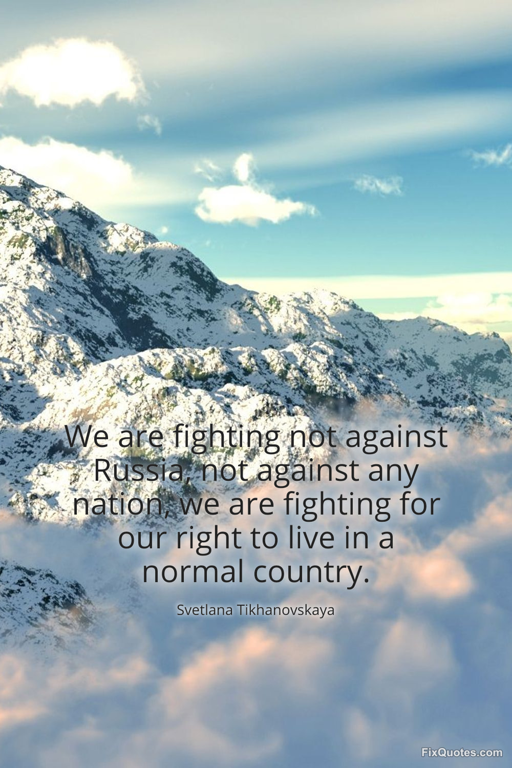 Tikhanovskaya, Svetlana. "We are fighting not against Russia, not against any nation, we are fighting for our right to live in a normal country." FixQuotes. January 26, 2026. https://fixquotes.com/quotes/we-are-fighting-not-against-russia-not-against-184595/.