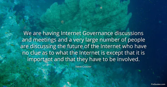 Crocker, Steve. "We are having Internet Governance discussions and meetings and a very large number of people are discussing the future of the Internet who have no clue as to what the Internet is except that it is important and that they have to be involved." FixQuotes. January 16, 2026. https://fixquotes.com/quotes/we-are-having-internet-governance-discussions-and-133511/.